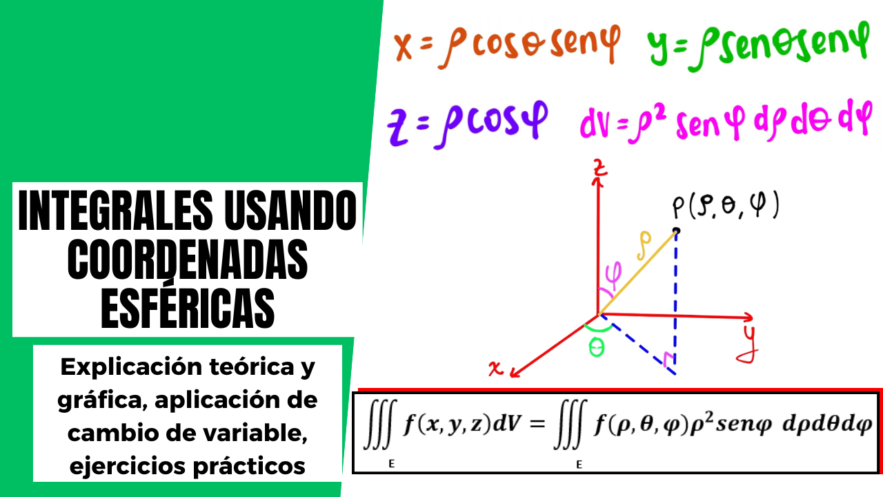 Estudiarás las propiedades de las coordenadas esféricas, realizarás representaciones gráficas de puntos en el espacio empleándolas, calcularás el jacobiano para coordenadas esféricas, trabajarás con integrales triples en este sistema mediante el cambio de variables resolviendo ejercicios sobre regiones esféricas, podrás calcular volúmenes, masas, centros de masa. Además identificarás fácilmente aquellos problemas donde es conveniente utilizar las coordenadas esféricas para la simplificación de las integrales, tendrás acceso a ejercicios de cálculo de volúmenes de esferas, conos y otros sólidos con simetría esférica.
