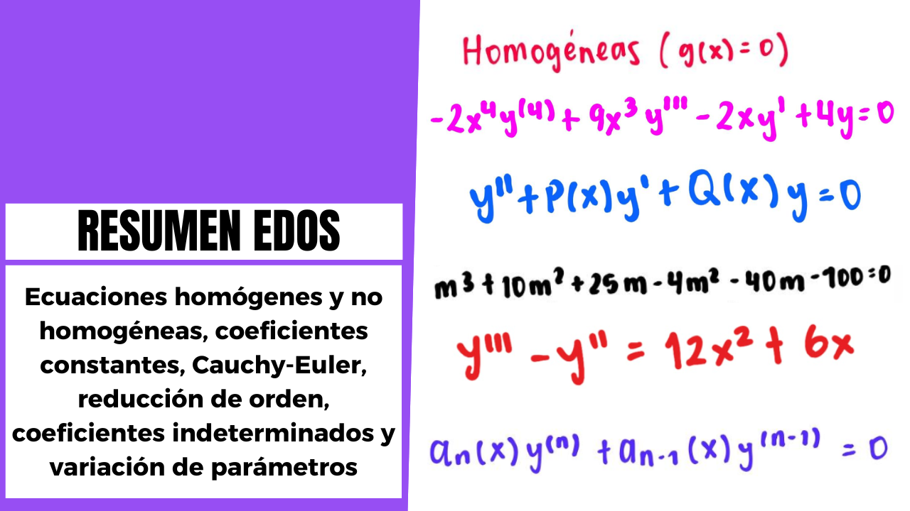 Conocerás todo sobre las EDOs, su clasificación (orden, linealidad, homogéneas o no homogéneas), abordarás las diferentes formas de soluciones, repasarás los métodos de resolución para EDOs de primer orden, variables separables, ecuaciones lineales de primer orden, factor integrante, exactas, Bernoulli, homogéneas y ecuaciones diferenciales reducibles. Tendrás una introducción detallada de las ecuaciones diferenciales de segundo orden y superiores, destacando su conexión con las de primer orden, además resolverás ejemplos de nivel.