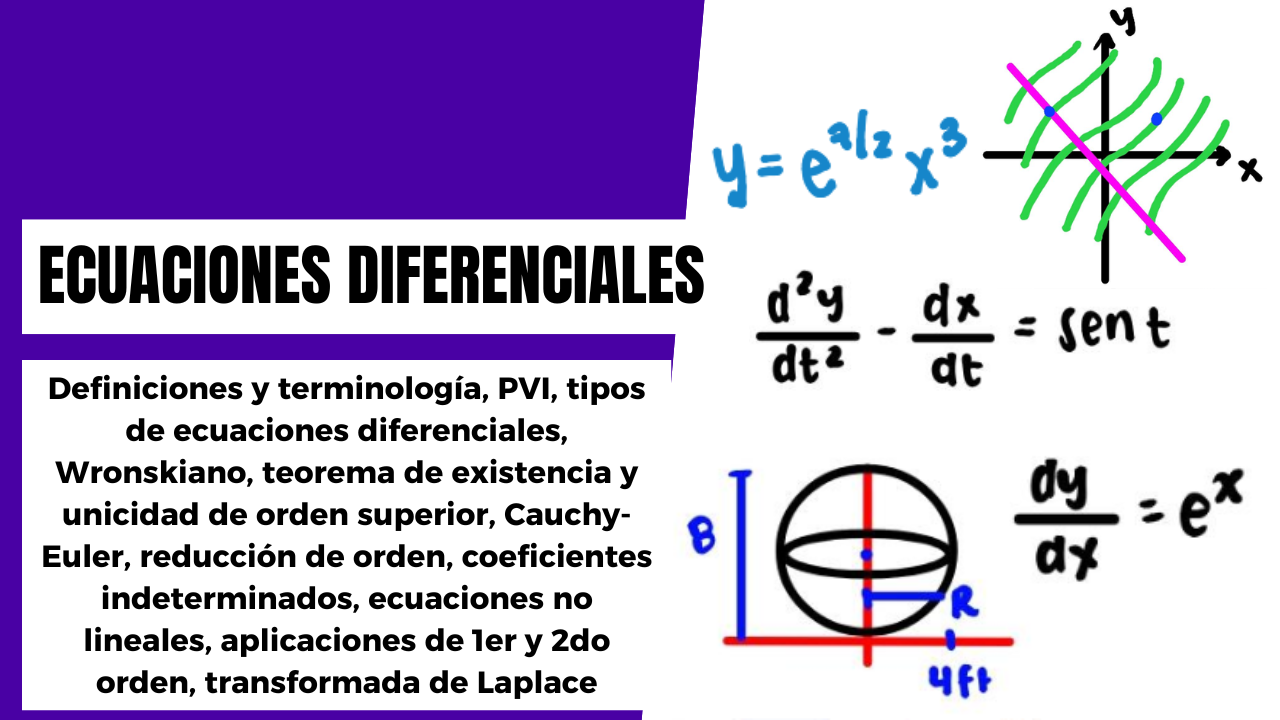 Aprenderás todo sobre la terminología y clasificación de ecuaciones diferenciales, sus diferentes modelos matemáticos para aplicaciones como crecimiento poblacional, decaimiento radioactivo, vida media, propagación de una enfermedad, circuitos LR y RC, ley de enfriamiento de Newton, mezclas, caída libre, vaciado de tanques, caída con resistencia al aire y ecuación logística. También trabajarás con las ecuaciones diferenciables separables, transformable a separables, lineales, exactas, transformables a exactas, Bernoulli, homogéneas con coeficientes constantes y no homogéneas. Estudiarás diversos métodos de solución para ecuaciones de segundo orden como las tipo Cauchy-Euler, desde coeficientes indeterminados hasta variación de parámetros, incluyendo las ecuaciones no lineales y sus aplicaciones. Tendrás múltiples ejercicios sobre la Transformada de Laplace con los cuales pondrás en práctica tus conocimientos sobre su definición, propiedades y el teorema de convolución.